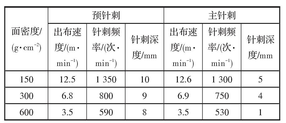 針刺頻率和針刺深度對布面強(qiáng)力有重要的影響。對于高強(qiáng)滌綸紡黏針刺土工布來講,布的面密度越大,生產(chǎn)速度越慢,針刺頻率越低;面密度偏小時(shí),針刺工藝正好相反。針刺深度調(diào)整原則如下:①單絲強(qiáng)力較高時(shí),針刺深度深一些;②面密度較大時(shí),針刺深度淺一些;③預(yù)針刺深度比主針刺深一些。