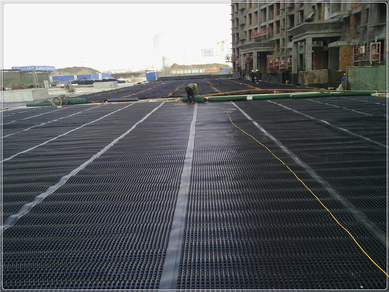 排水層的傳統(tǒng)構造是采用厚度不小于100mm的卵石、碎石或陶粒,其中陶粒的通水性能略遜于前二者,傳統(tǒng)做法對屋面結構會產(chǎn)生較大的承載壓力。隨著部分外資工程的建設,(蓄)排水板從歐美引入我國,憑借其重量輕、施工便捷、造價低的優(yōu)勢逐漸成為(蓄)排水層的主流用料。(蓄)排水板又分為網(wǎng)格交織型和凹凸型兩種,其中由于常規(guī)的凹凸型(蓄)排水板售價略低并兼具一定的蓄水性能,目前應用相對較多。