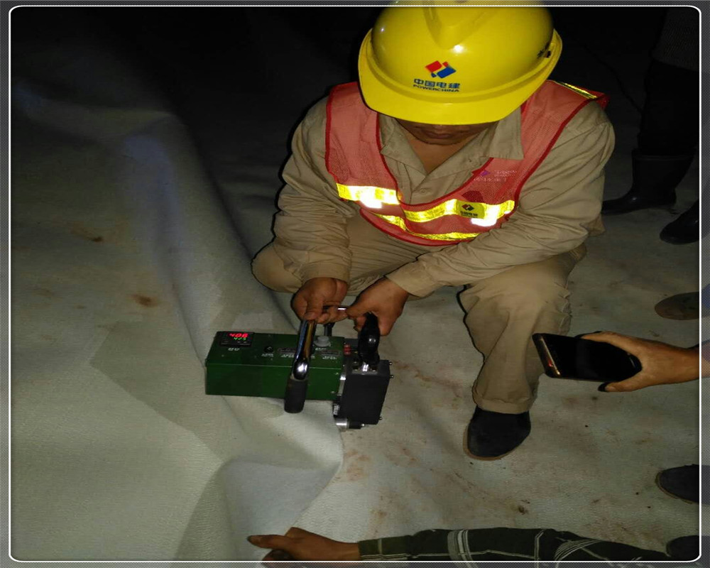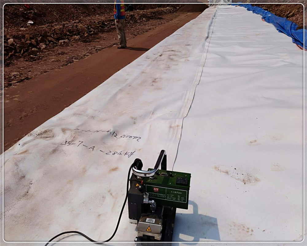樞紐主要由復合土工膜堆石壩、溢洪道、引水發(fā)電系統(tǒng)、放空洞組成。復合土工膜堆石壩壩高85m,為高比例(達81%)軟巖填筑,軟巖填筑比例在同類型壩中世界之高。大壩防滲體采用復合土工膜防滲面板。土工膜之間的焊接和土工膜在錨帶部位的焊接,兩部位均采用熱風粘合的方式。土工膜與土工膜之間的焊接采用全自動風焊機進行,焊接帶的寬度為65mm,中間留有15mm的檢查氣孔,兩側各有25mm寬的粘合段。