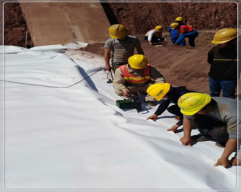 在堆石壩軟巖填筑比例大情況下,土工膜直接設置在壩面做為永久性防滲面墻且不設面層保護,和鋼筋混凝土面板相比,復合土工膜防滲面板適應壩體較大沉降變形,使用中有一定褶皺但無破損現(xiàn)象,即使破壞也只需局部切割修補方便,土工膜與趾板的連接做法先進。